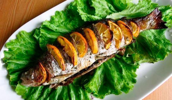 - Рыба выкладывается на большое блюдо, после чего поливается соусом.