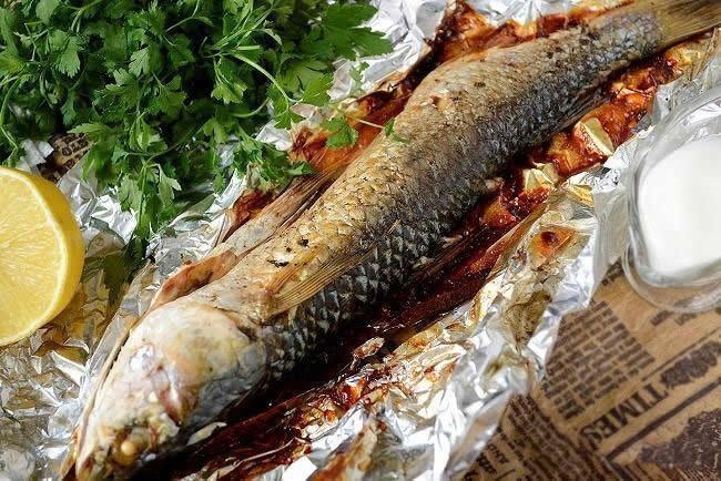- В фольгу, предварительно смазанную маслом, выложить рыбу и плотно завернуть ее. Если внутри останется пространство, то мясо получится пропаренным, нежели запеченным. Плотное прилегание фольги позволит зарумянить кожицу пеленгаса.