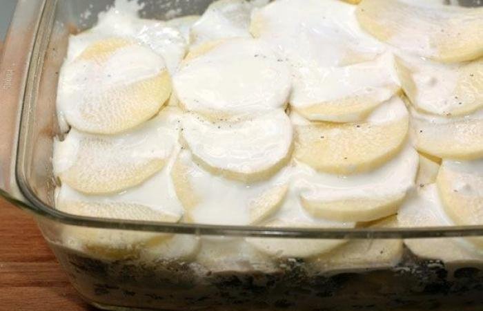 - Последний слой – картофель, нарезанный тонкими кружками.
