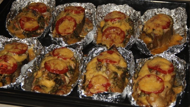 - Выложить на фольгу шкуркой вниз и сбрызнуть лимонным соком. Мякоть посыпать луком, потом накрыть кольцами помидора и сверху засыпать сыром. Свернуть края фольги в форме лодочки, чтобы сок при запекании остался внутри. Во все порции положить по несколько листьев тархуна. Поставить в духовой шкаф на 7-10 минут, пока на сыре не появится румяная корочка.