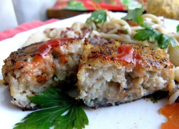 - Формируют котлеты и выкладывают на горячую сковороду, сбрызгивая каждую котлету лимонным соком. Обжаривают до золотистой корки с обеих сторон.