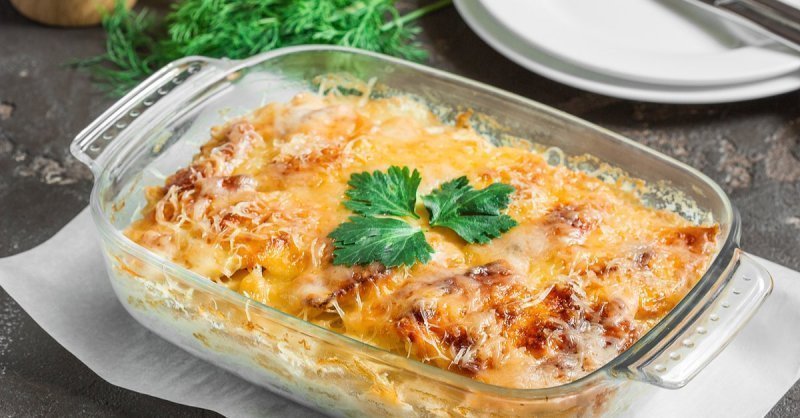 - Готовый картофель выложить на противень. Сверху разместить тушу рыбы. Посыпать твердым сыром и запекать при 200°С до полной готовности.