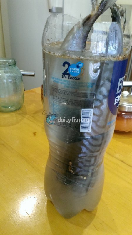 Предлагаю опробовать способ засола, который избавит вас от этой проблемы. Подходит для всей морской рыбы – сельдь, ставрида, салака, мойва, скумбрия и т.д. Итак, вместо нержавеющей или эмалированной емкости предлагаю использовать двухлитровую пластиковую бутылку из-под минеральной воды. Срезаем у пустой бутылки верхушку, на дно наливаем пару ложек подсолнечного масла, насыпаем специи (1 чайная лодка семян кориандра, 1/2 ч. ложки черного перца и несколько горошин душистого перца), запихиваем в бутылку две селедки или скумбрии. Заливаем рассолом - на 1 литр воды 6 столовых ложек соли и две столовых ложки сахара.