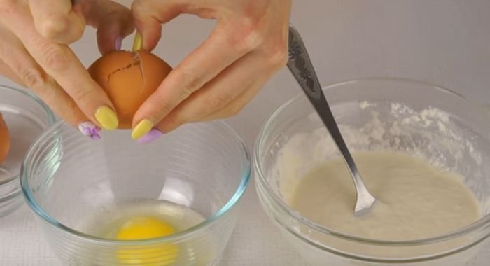 - В отдельной мисочке взбалтываем яйца и переливаем в тесто, перемешиваем до однородной консистенции.