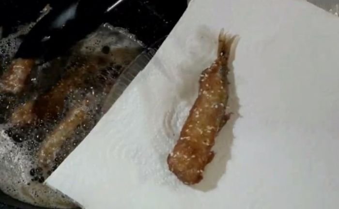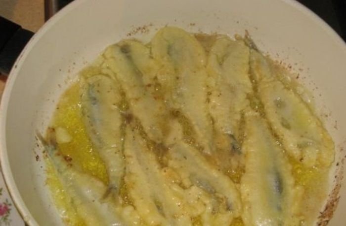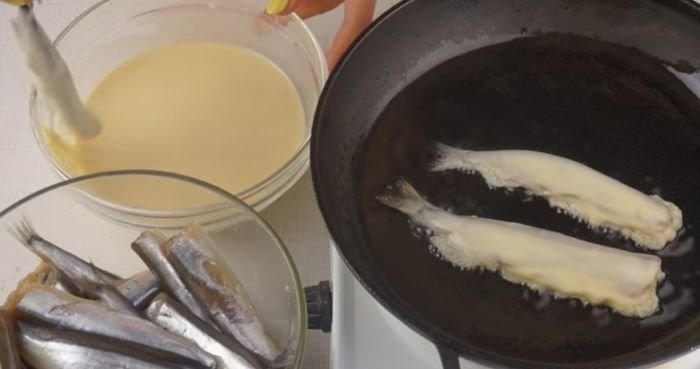 - Каждую тушку окунаем в кляр и обжариваем на хорошо разогретом масле с двух сторон до румяности.