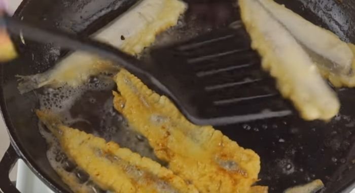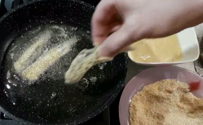 - Каждую рыбку окунаем в кляр, панируем в сухарях и жарим в масле на сильном огне с двух сторон до румяной корочки.
