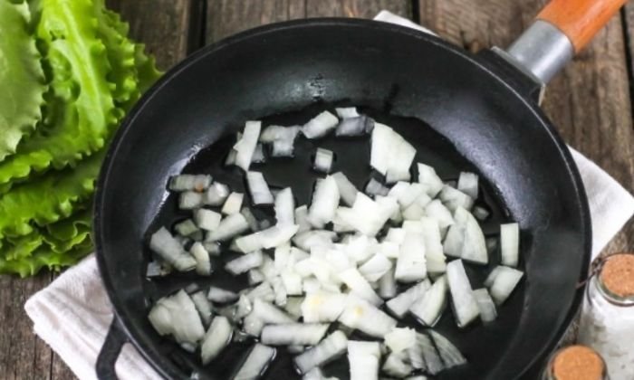 - Лук нарезаем небольшими кубиками и в течение 3 минут пассируем до прозрачности, сильно не зажариваем.