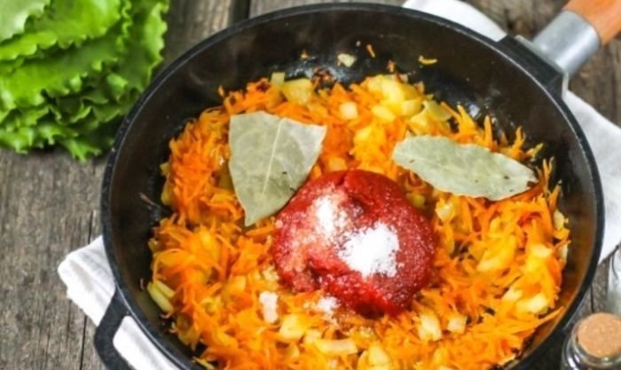 - К овощной пассировке добавляем томат-пасту, всыпаем соль вместе с перцем и сахаром, кладем лавровые листики.
