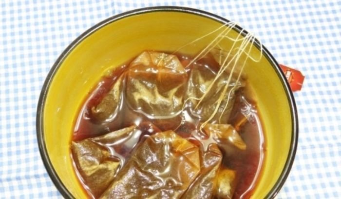 - В миску кладем чайные пакетики, заливаем кипятком и даем настояться. Можно использовать и листовой чай, тогда после заварки его нужно будет процедить.