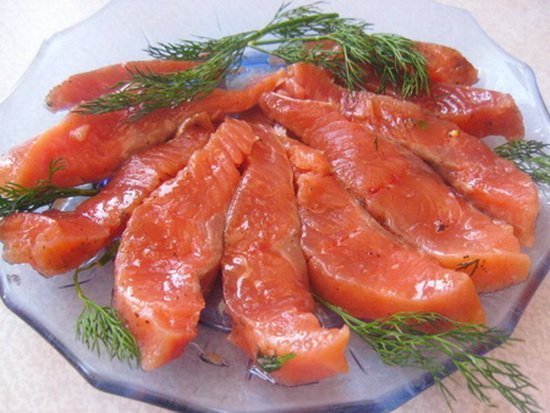 Филе горбуши должно быть мягким. Чтобы точно рассчитать нужное количество соли, филе желательно взвесить. Желательно, так же отрезать голову с плавниками и хвостом. Нарезается филе на кусочки, толщиной не больше полтора сантиметра, чтобы мясо хорошо пропиталось рассолом с приправами.
