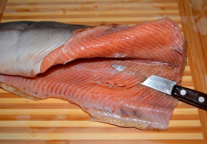 Очень важно правильно подготовить рыбу к процессу засолки. Лучше, конечно, если это будет свежая рыба, но ее можно приобрести только в тех местах, где занимаются ее промыслом. Скорее всего, это будет свежемороженая тушка, которую необходимо разморозить, причем, правильно. Никогда нельзя форсировать этот процесс и дать возможность рыбе разморозиться естественным путем в холодильнике. Нужно дать возможность, чтобы ушла вся вода, после чего ее разделывают и промывают под проточной водой. При чистке рыбы следует позаботиться о том, чтобы не осталось в мясе костей.