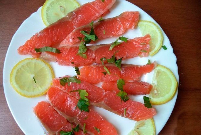Подготовленные из горбуши филе следует нарезать кусками, в зависимости от личных предпочтений. При этом, следует брать во внимание тот факт, что чем больше куски, тем дольше они будут готовиться. Соль, сахар и черный перец смешиваются вместе. Куски тщательно натираются сухой смесью со всех сторон. Лимоны нарезаются на тоненькие дольки. В подготовленную посуду выкладываются куски рыбы, при этом, каждый кусок следует переложить долькой лимона. После этого рыба оставляется на 10 часов. По истечении этого времени рыба заливается растительным маслом и оставляется еще на 3 часа, после чего горбушу можно подавать к столу.
