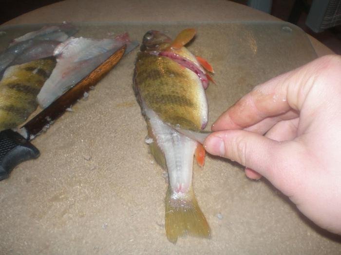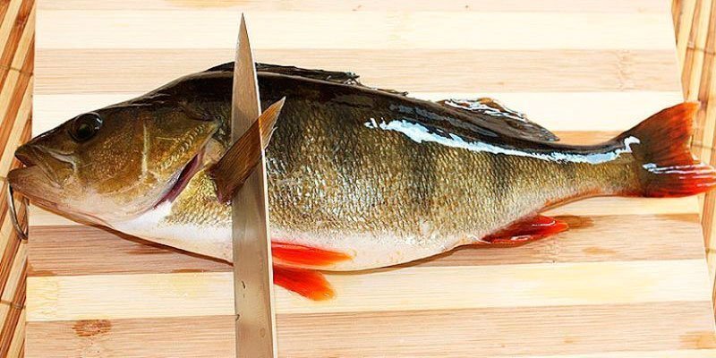 Этот способ разделки рыбы годится тогда, когда кожа для приготовления не нужна. В первую очередь, с окуня отрезается голова и плавники, после чего тушку помещают в морозильную камеру на короткое время.