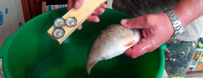 Чего только не придумано домашними умельцами, чтобы облегчить труд человека при очистке окуня от чешуи. Некоторые умельцы используют металлические пробки из-под бутылок для пива. Пробки крепятся в один ряд зубьями вверх, на деревянной планке. Подобное изобретение не требует никаких материальных затрат, а сам процесс изготовления занимает минимум времени.