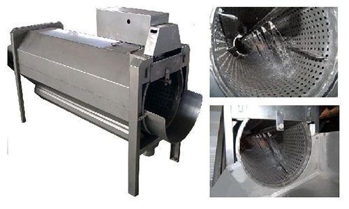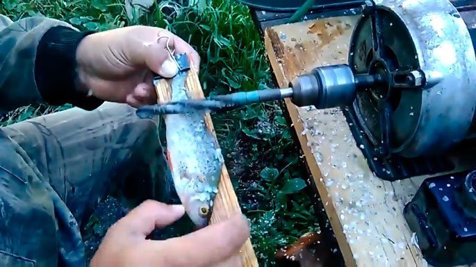 Это приспособление разработано специально для съема чешуи с рыбы, когда требуются большие объемы работ. Внутренняя поверхность барабана обладает крупным абразивным эффектом за счет рельефа, что и позволяет снимать с рыбы чешую. Чтобы это произошло, рыбу помещают внутрь барабана и обильно поливают водой. Когда барабан начинает вращаться, то благодаря острой, шершавой поверхности, чешуя начинает отслаиваться от кожи рыбы. Машинка способна обработать за час до 200 кг рыбы и работать в полуавтоматическом режиме. Загрузка рыбы осуществляется в ручном режиме.