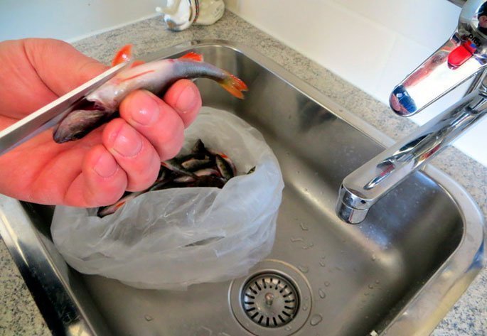 Как вариант, можно воспользоваться кипятком, чтобы облегчить себе задачу. Для этого нужно вскипятить воду и поместив мелкого окуня в дуршлаг, опустить его на некоторое время в кипяток. Если будет сниматься чешуя с кожей, то это не проблема, главное, что получается очень быстро. При этом, не следует забывать удалять у «мелочи» внутренности.