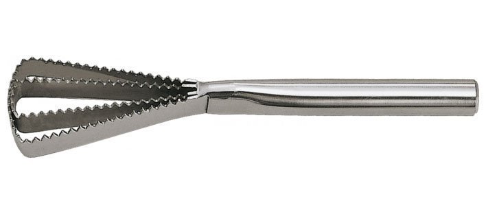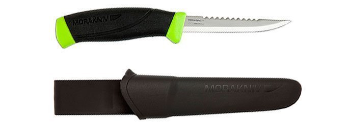 Это достаточно универсальный инструмент с двухсторонней заточкой, одна из сторон имеет волновое лезвие, которое предназначенное для нарезки таких продуктов, как овощи, хлеб, сыр, масло и прочие, а вторая сторона лезвия – зубчатое, которое предназначается для разделывания мясных продуктов, таких как рыба. Зубчатая сторона лезвия отлично перепиливает кости и плавники, а также отлично справляется с отшелушиванием чешуи.