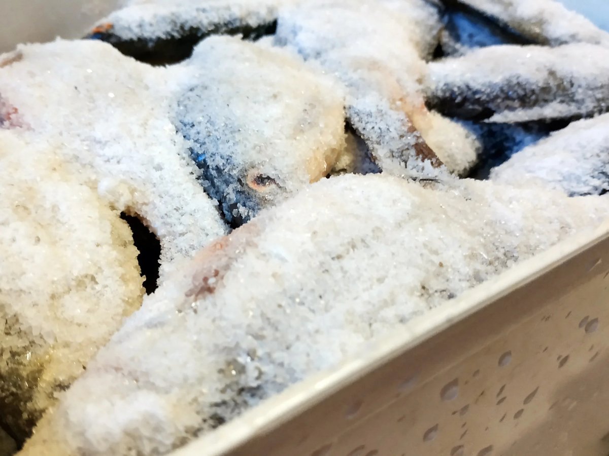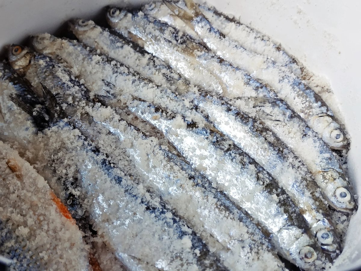 Рыба выкладывается слоями, каждый из которых посыпается крупнозернистой солью. При этом в нижнем слое находится наиболее крупная рыба (если она не откалибрована по размеру).