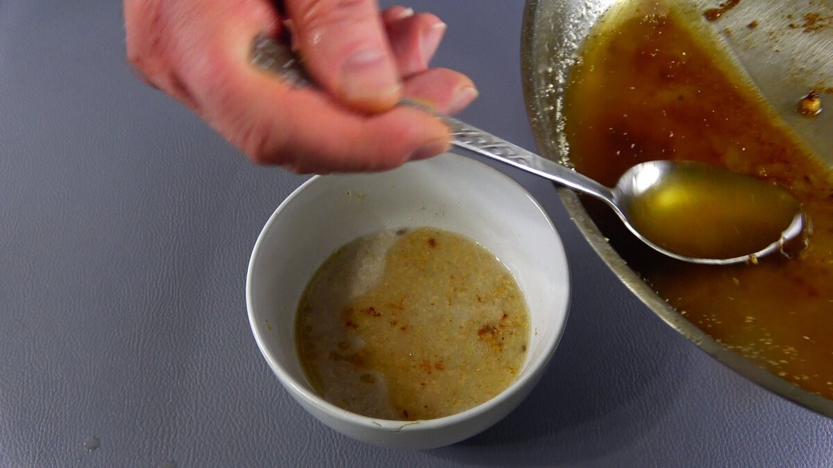 Когда вся рыба пожарена, добавляю в муждей немного масла из сковороды и перемешиваю. Вот теперь соус готов к употреблению.