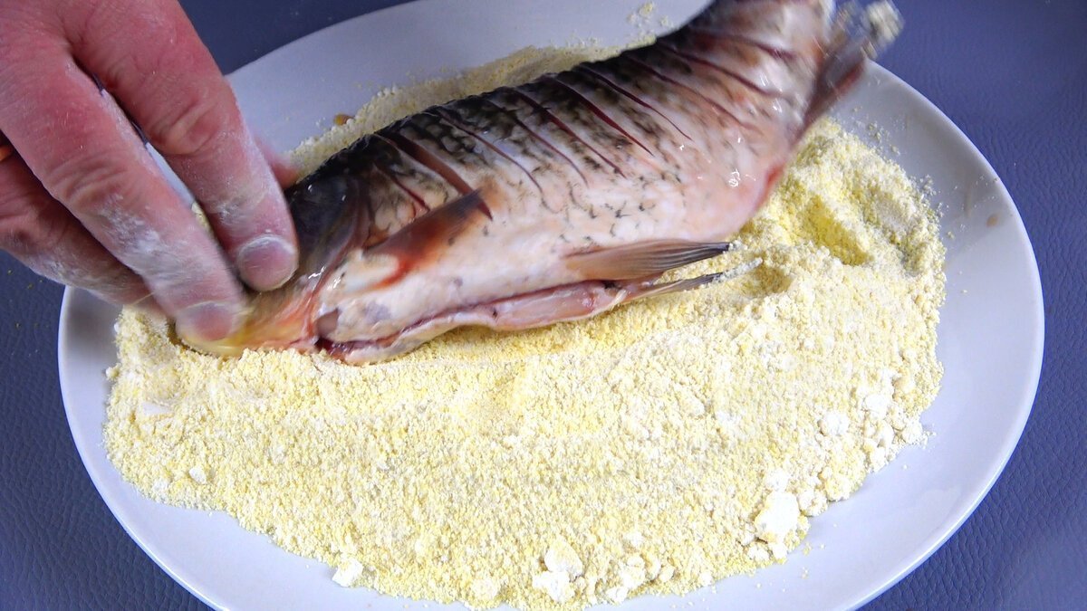 Смешиваю в равных пропорциях кукурузную крупу и пшеничную муку. Обваливаю в этой панировке рыбу.