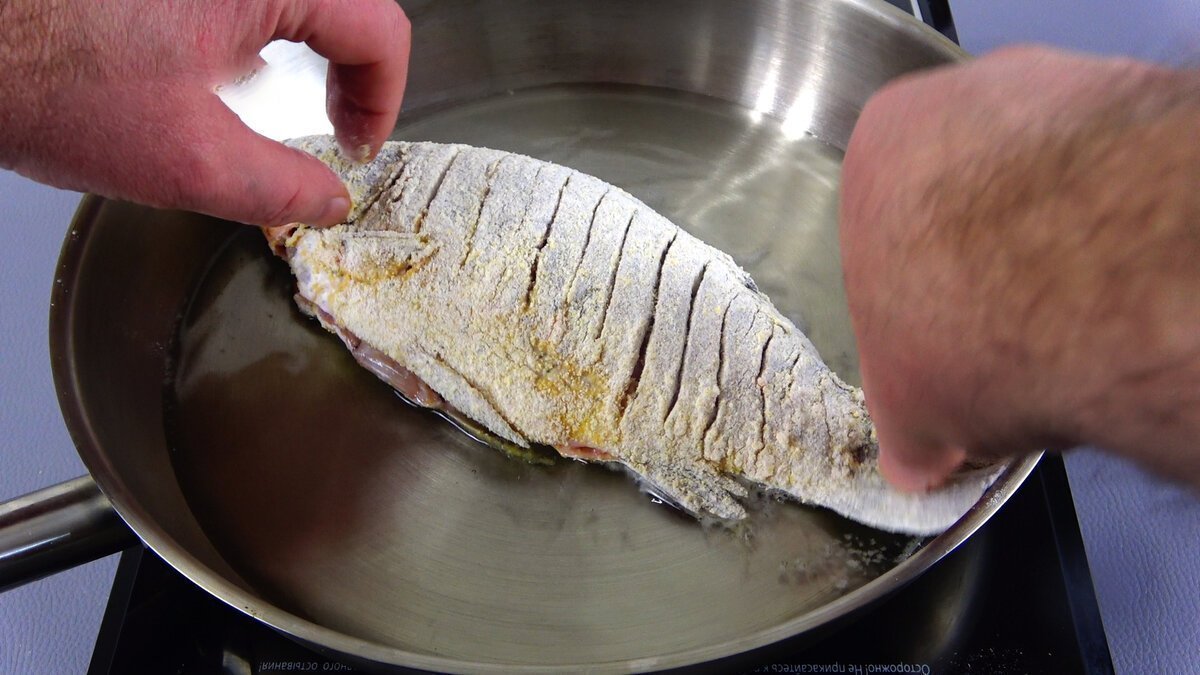 Выкладываю в разогретую сковороду с подсолнечным маслом. Масла должно быть много, иначе рыба просто высохнет, а не прожарится.