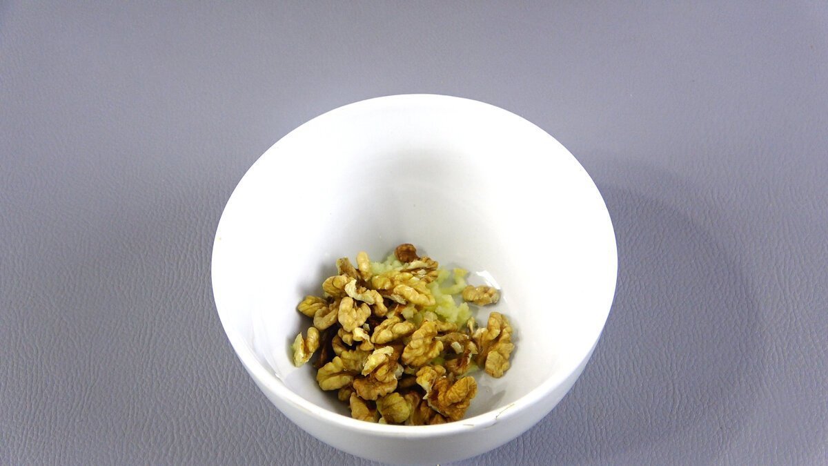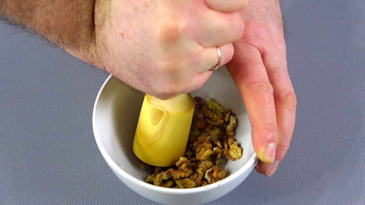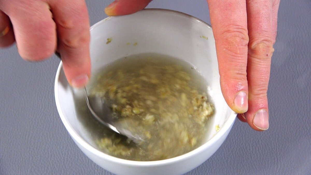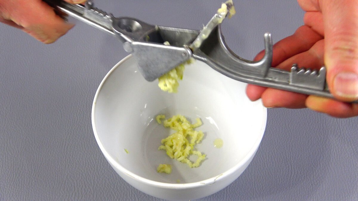Пока рыба обжаривается, приготовлю муждей. Этот соус является важным дополнением к рыбе в Молдавии. Готовится просто, но для рыбы вкуснее не придумали. В чашу выдавливаю чеснок.