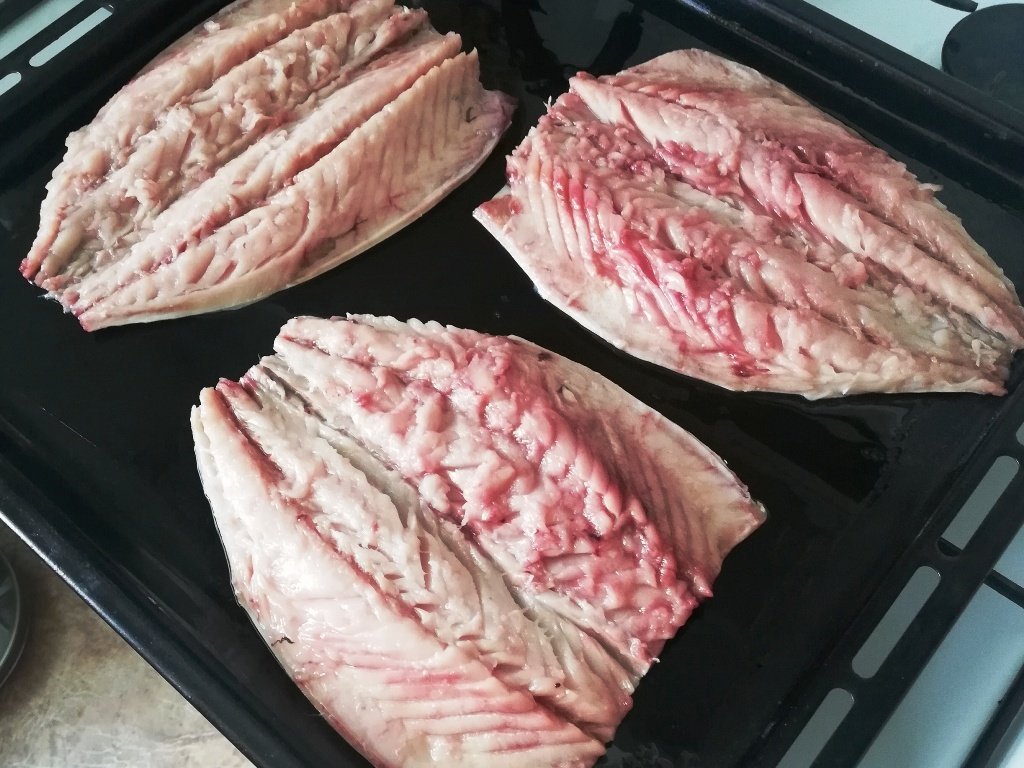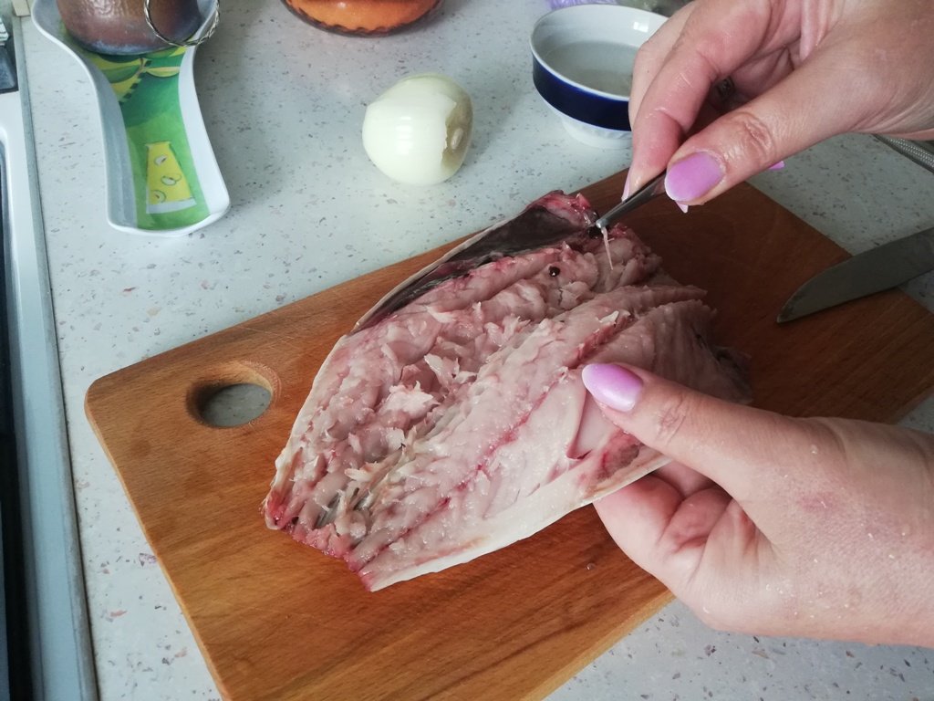 Разрезаем рыбу на «пласт» - вытаскиваем хребет и пинцетом тщательно убираем мелкие косточки.