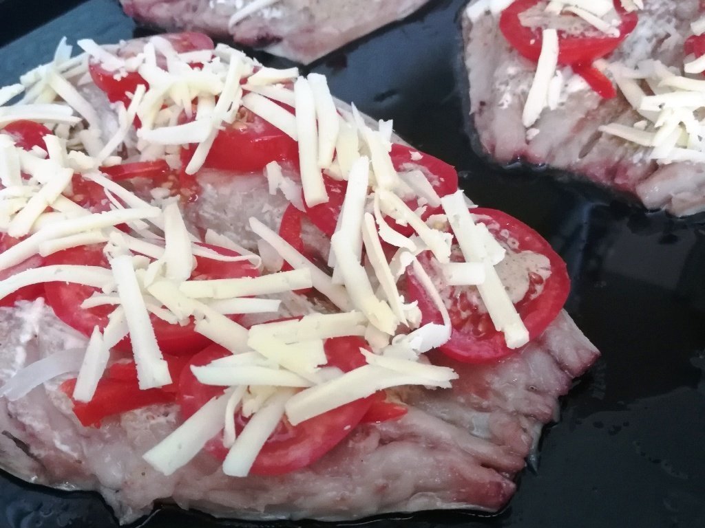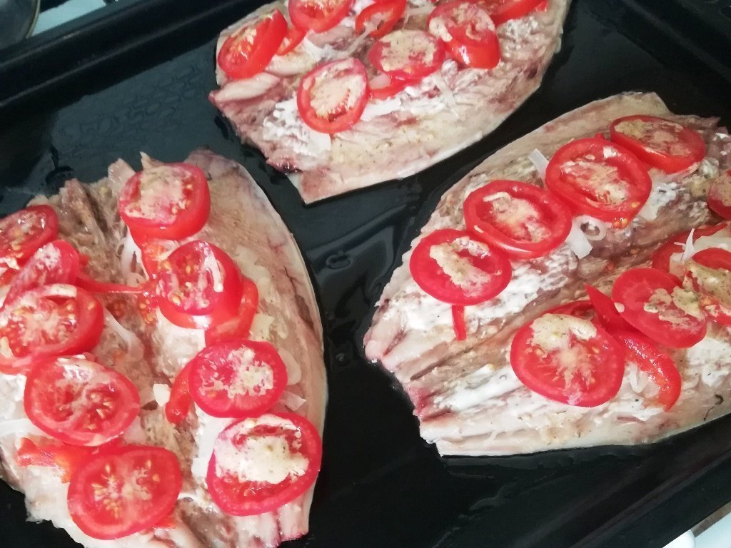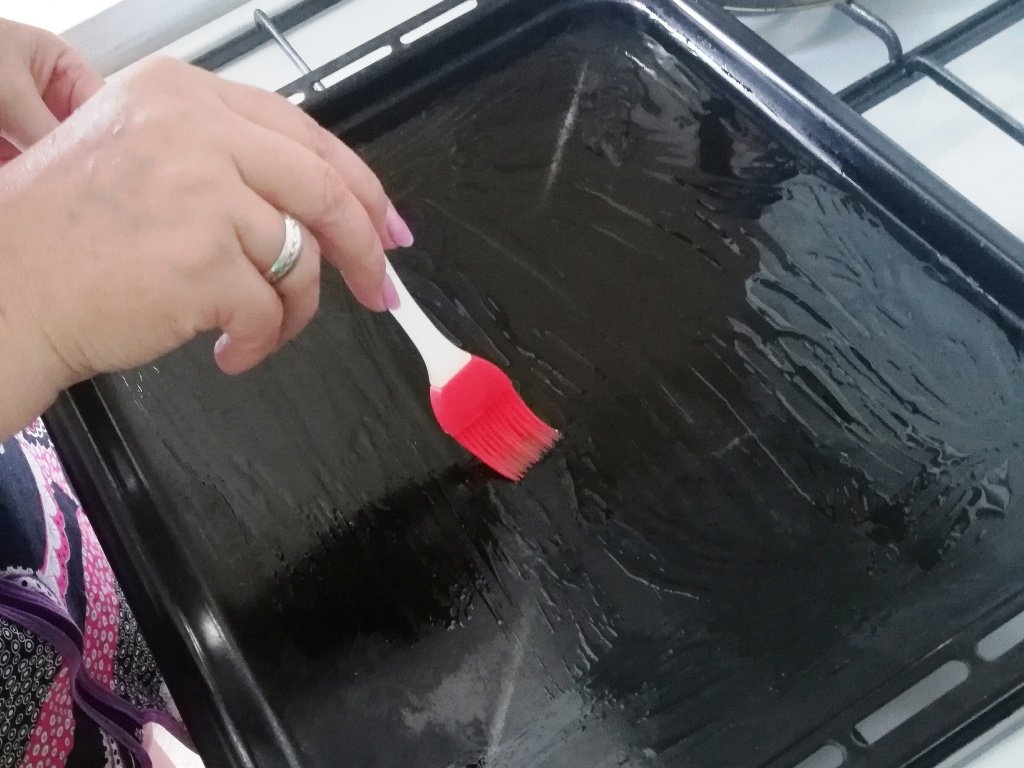 Включаем духовку на разогрев, тем временем, смазываем противень подсолнечным маслом. Вот здесь рекомендуется подстелить под низ кулинарную бумагу, т.к. в итоге рыба может «прилипнуть» и придется её «отдирать». Я этого не сделал, т.к. жирная скумбрия не липнет к противню, а вот более сухой минтай прилипает крепко.