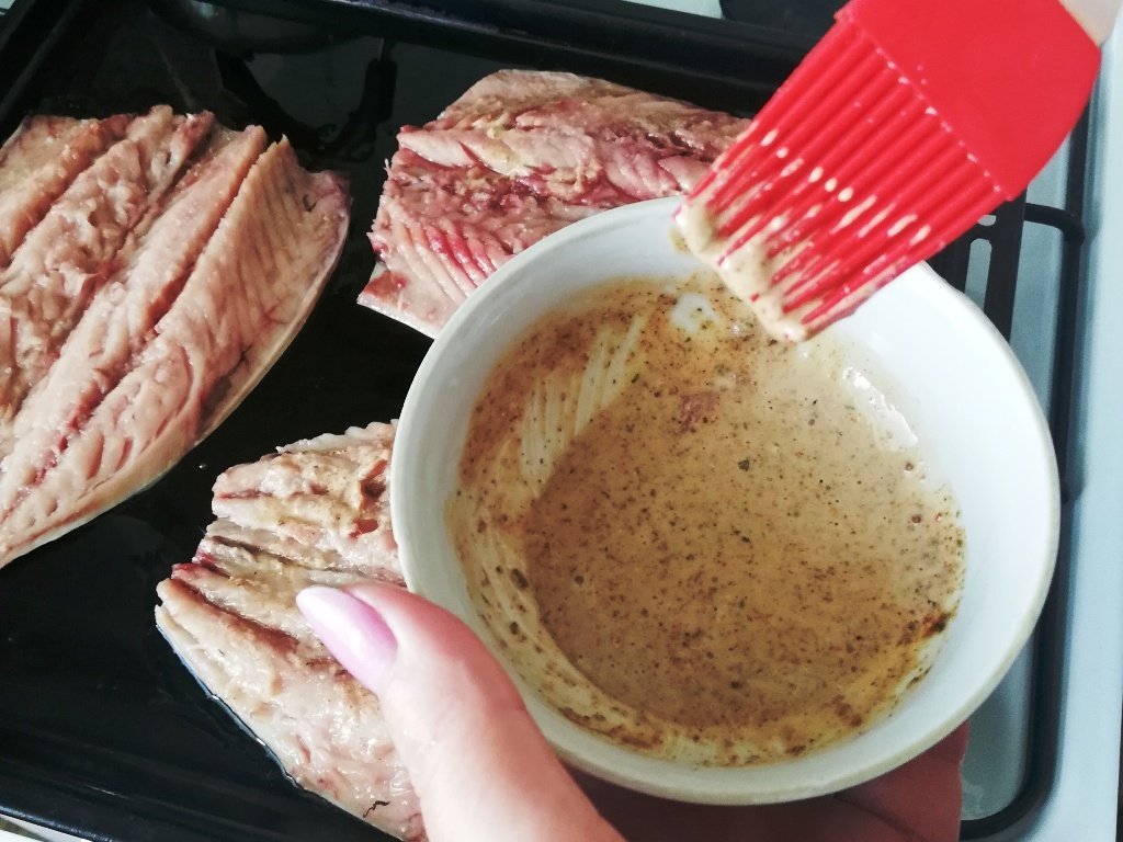 Ага, о заправке, чуть не забыл. В соевый соус добавляем горчицу, майонез, приправы – перемешиваем, добиваемся консистенции сметаны. Затем смазываем им рыбу.