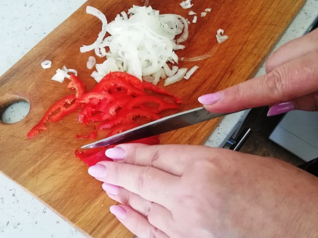 Тонко нарезаем полукольцами лук и сладкий перец, а черри – кругляшами.