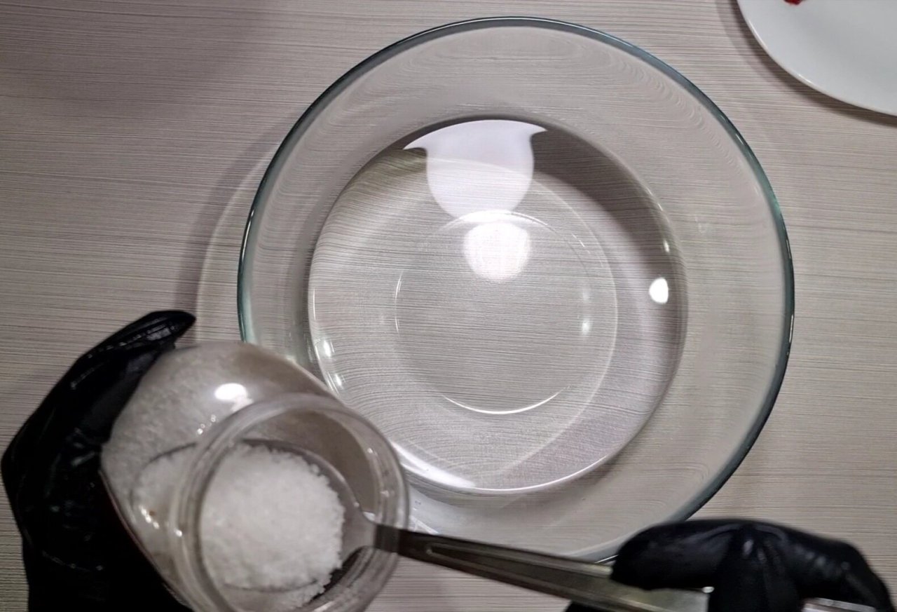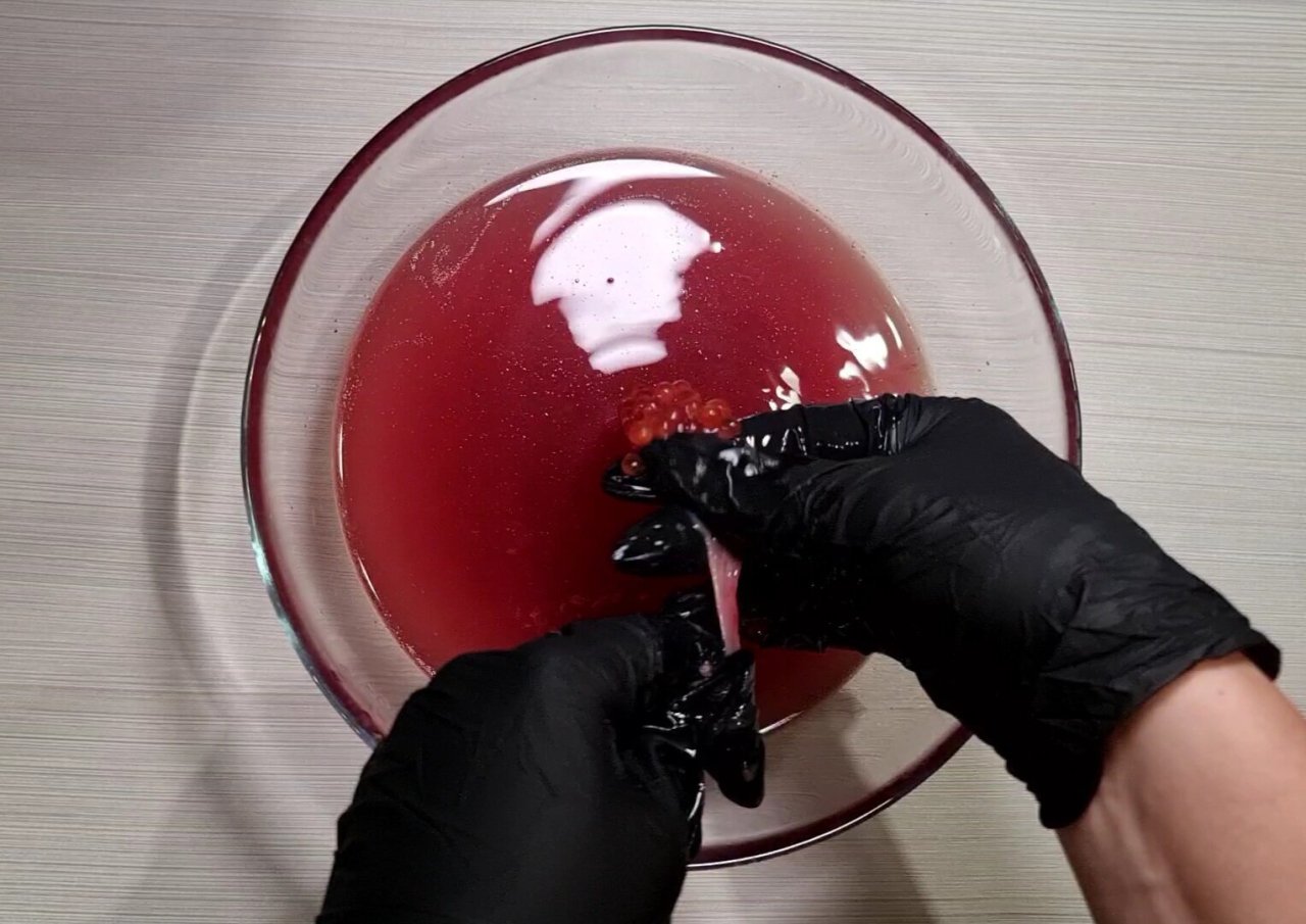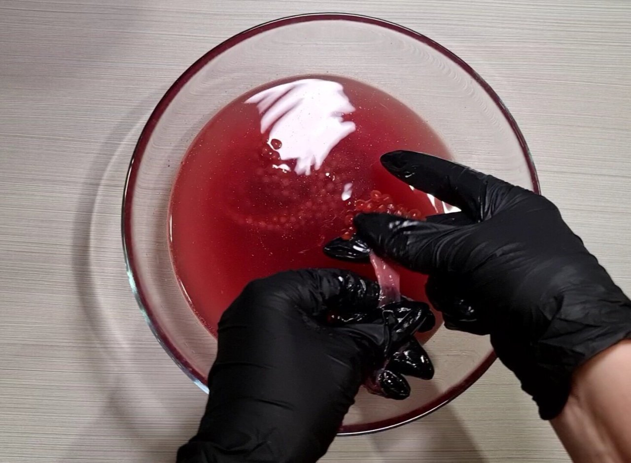 За счёт теплой воды и соли, плёнка, которой покрыта икра побелеет и уплотнится, таким образом ловким движением рук её можно отделить от плёнки.