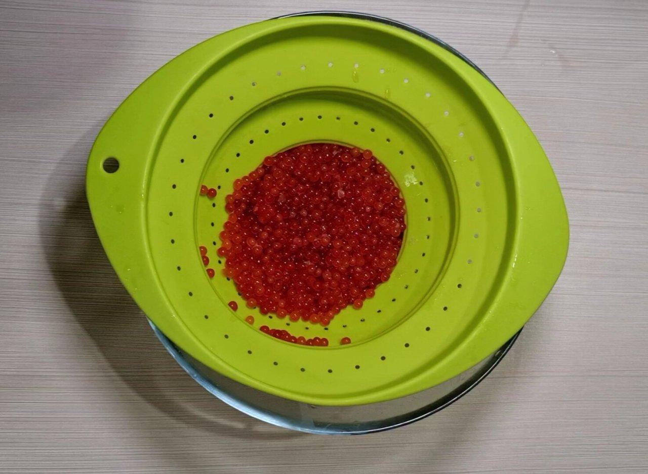 В этот же момент икра солится. Плавая в рассоле, пока мы отделяем всю плёнку, а это примерно 10-15 минут она просаливается до нужного вкуса. Получается малосольная, без горечи, рассыпчатая.