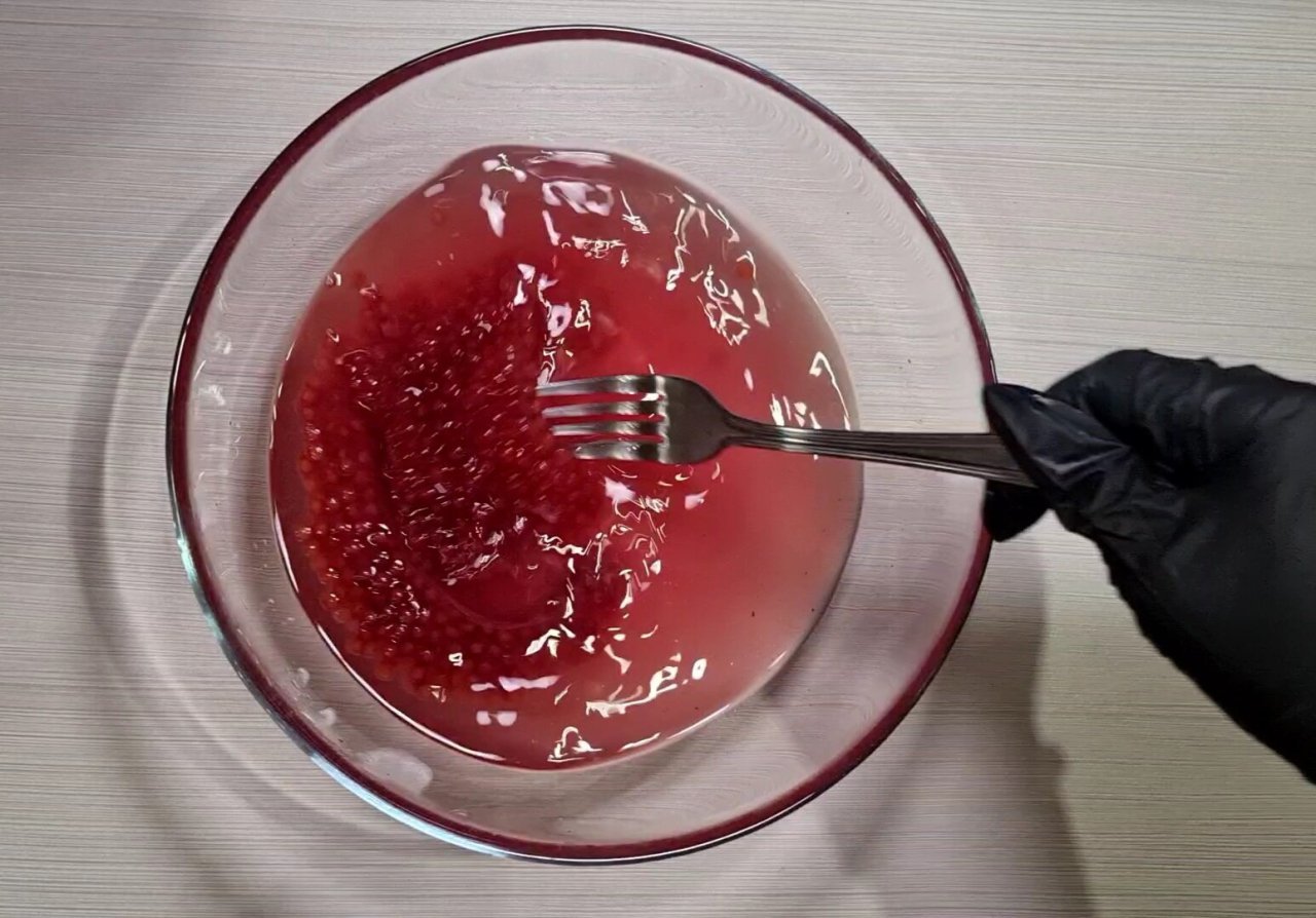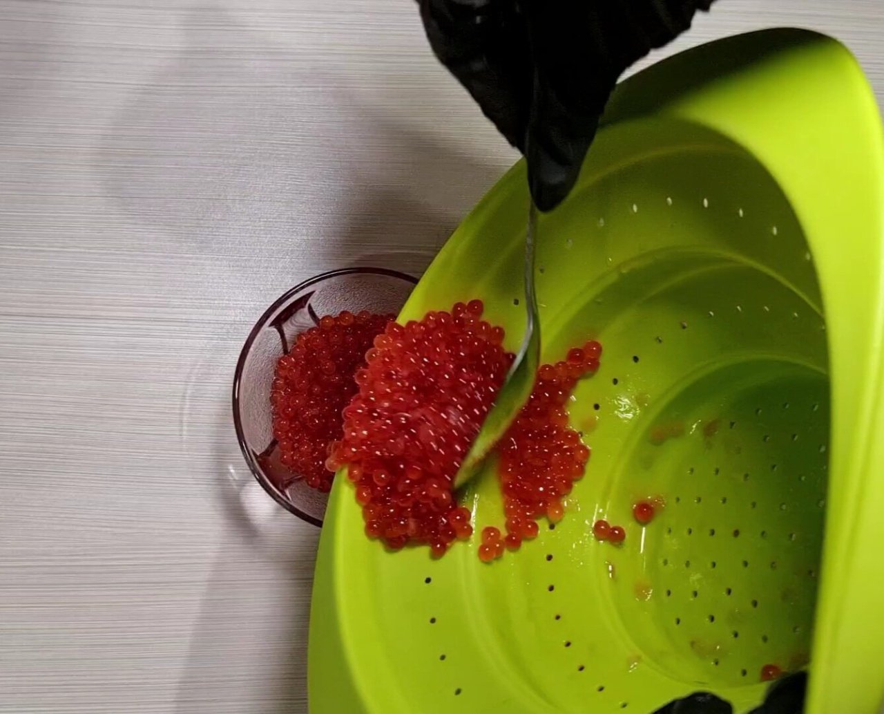 Опускаем в рассол икру, немножко полощем её с помощью вилки.