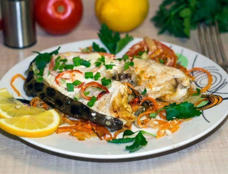 - После этого овощи обжариваются на сковородке и выкладываются поверх филе.