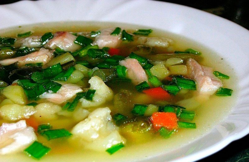 Все овощи чистятся и режутся, например, на кубики. В бульон добавляется измельченная картошка и рыба, после чего это все варится минут 15-ть. Оставшиеся овощи пассируются на сковородке около 7-ми минут и добавляются в суп. Суп еще варится минут 10-ть и солится по вкусу.