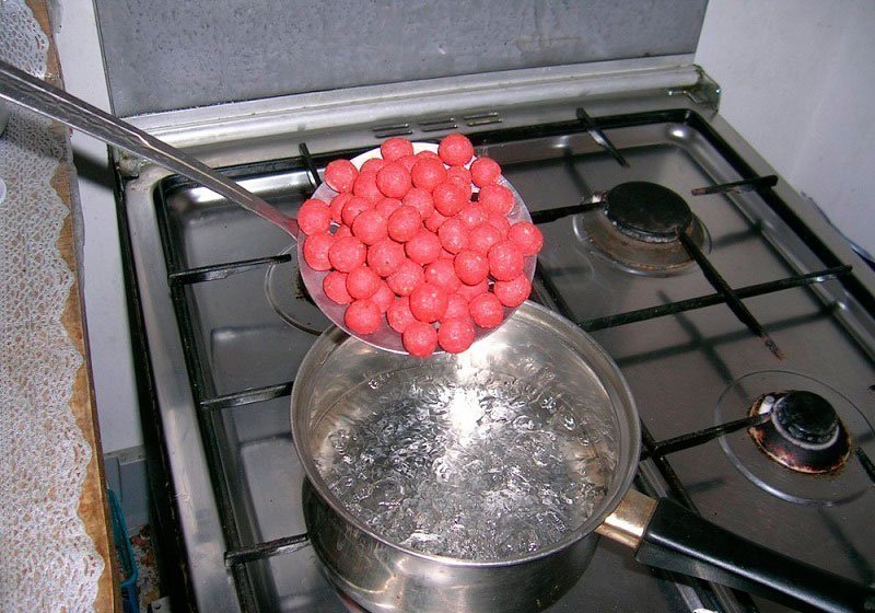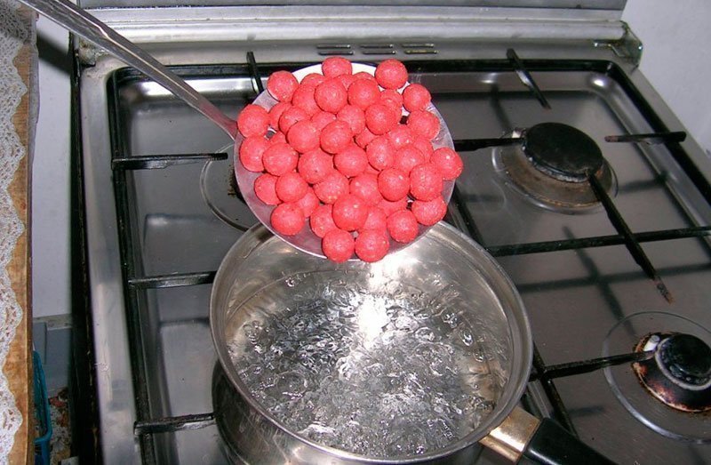 Как шарики будут сформированы, приступают к варке бойлов. Для этого нужно взять металлическое сито и выложить бойлы на него, после чего приманка опускается в кипяток. Как только шарики начинают всплывать, их вынимают.