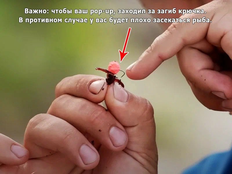 - Далее насаживаем наш pop-up. Очень важно, чтобы у вас загиб крючка прошел через него, в противном случае, рыба у вас не будет нормально засекаться;