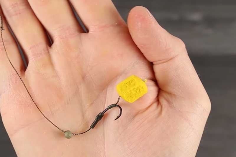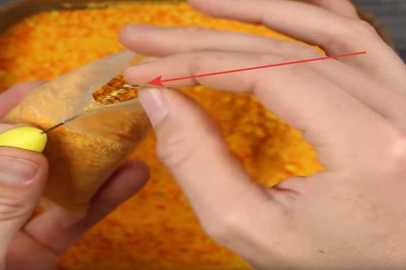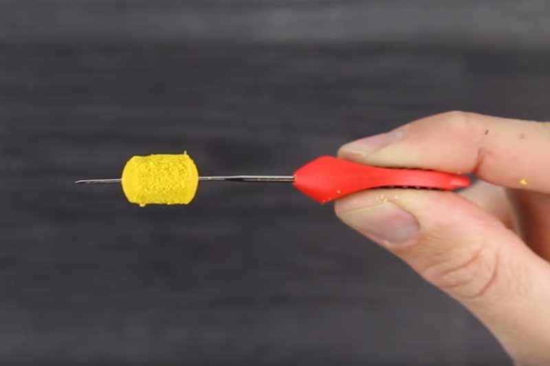 Оснастка - немаловажный элемент. Переходим к ее созданию. Берем одиночный плавающий бойл, подрезаем его аккуратно с двух сторон, стремясь добиться формы кукурузки. Используем иглу в качестве помощницы.