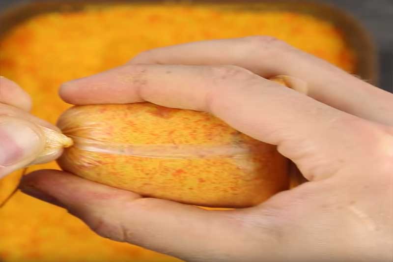 Плотненько формируем хвостик, скручивая его слюной, чтобы он как бы прилип к мешку.