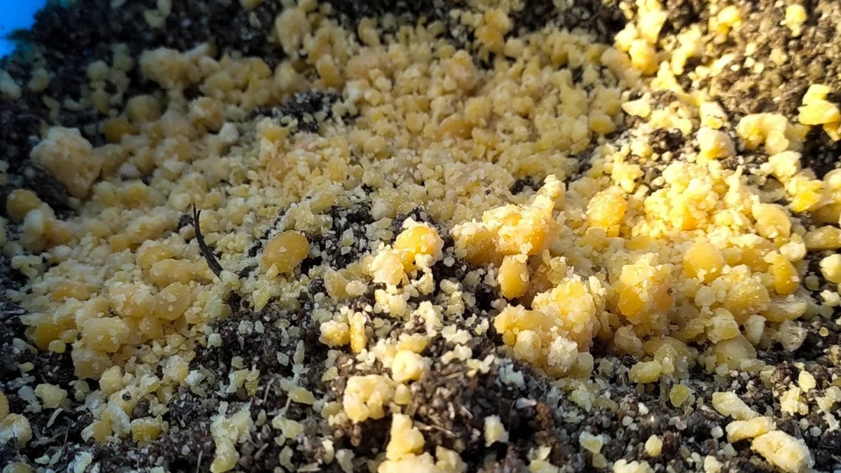 В прикормку добавляю небольшими порциями, сверху. Так он не "марается" о прикормку, цвета своего не теряет. Да и прикормка свойств своих не теряет, не переувлажняется, в кашу не превращается.