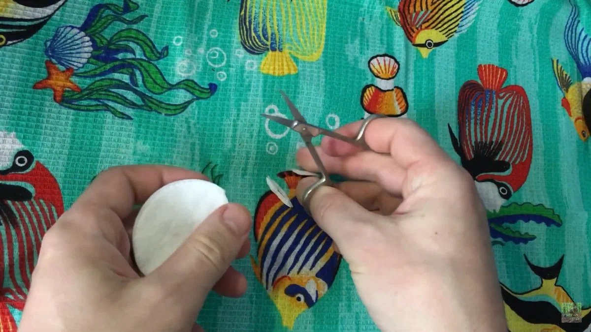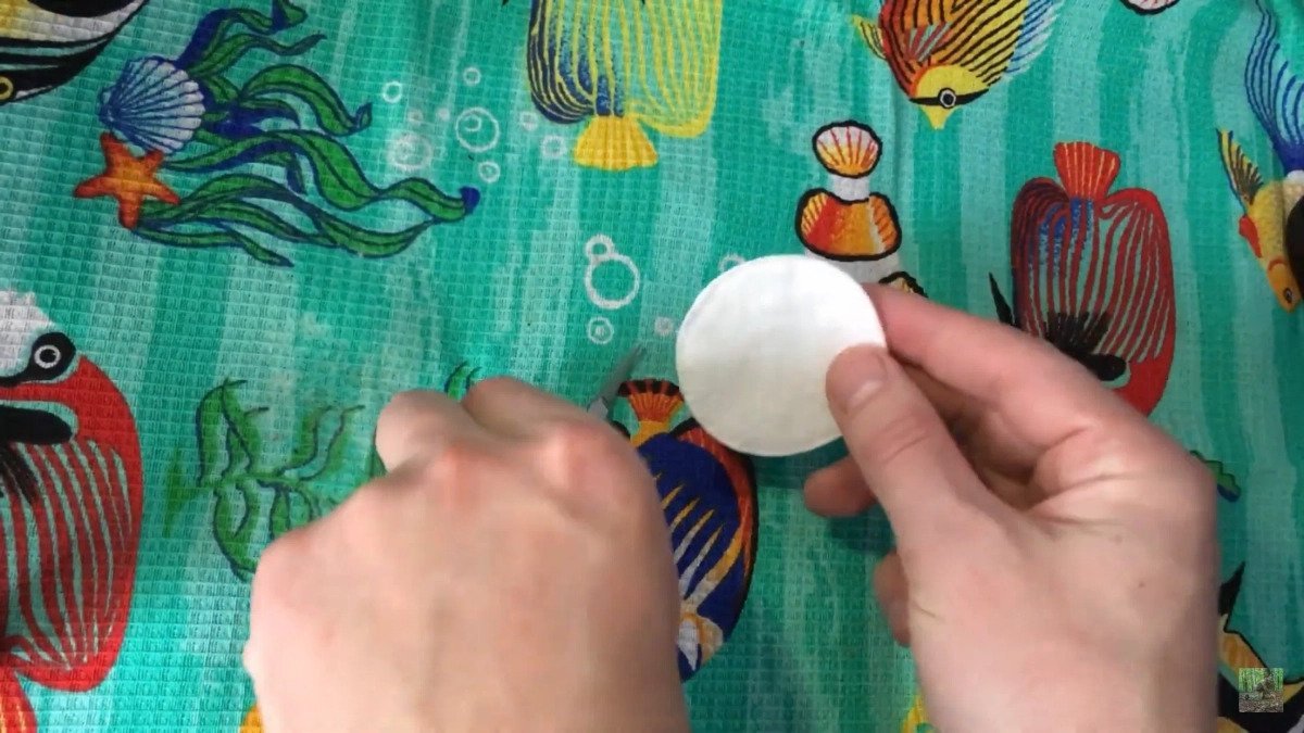 - Надеваем кусочек ватного диска на крючок, пробив так, чтобы жало было открытым. Макаем крючок с ватным диском в воду, после чего обмакиваем во взбитый желток.
