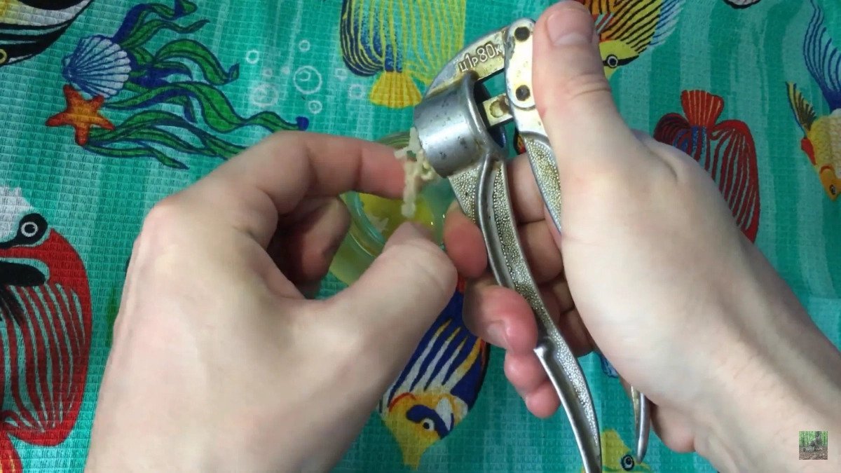 - После того, как взбили желток, добавляем ароматизатор. В моём случае это чеснок, так как данный аромат лучше подходит для холодной воды. Чеснока добавляем 1 небольшой зубчик, пропустив его через пресс, можно добавить сухой чеснок. Все тщательно перемешиваем.