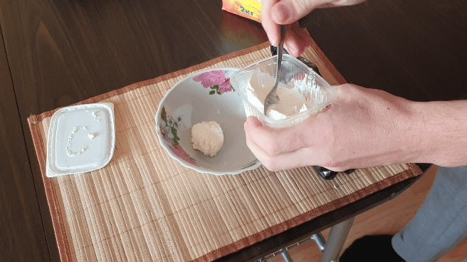 1. Отправляем 2 столовые ложки творожной массы в ёмкость, где будет замешиваться насадка.