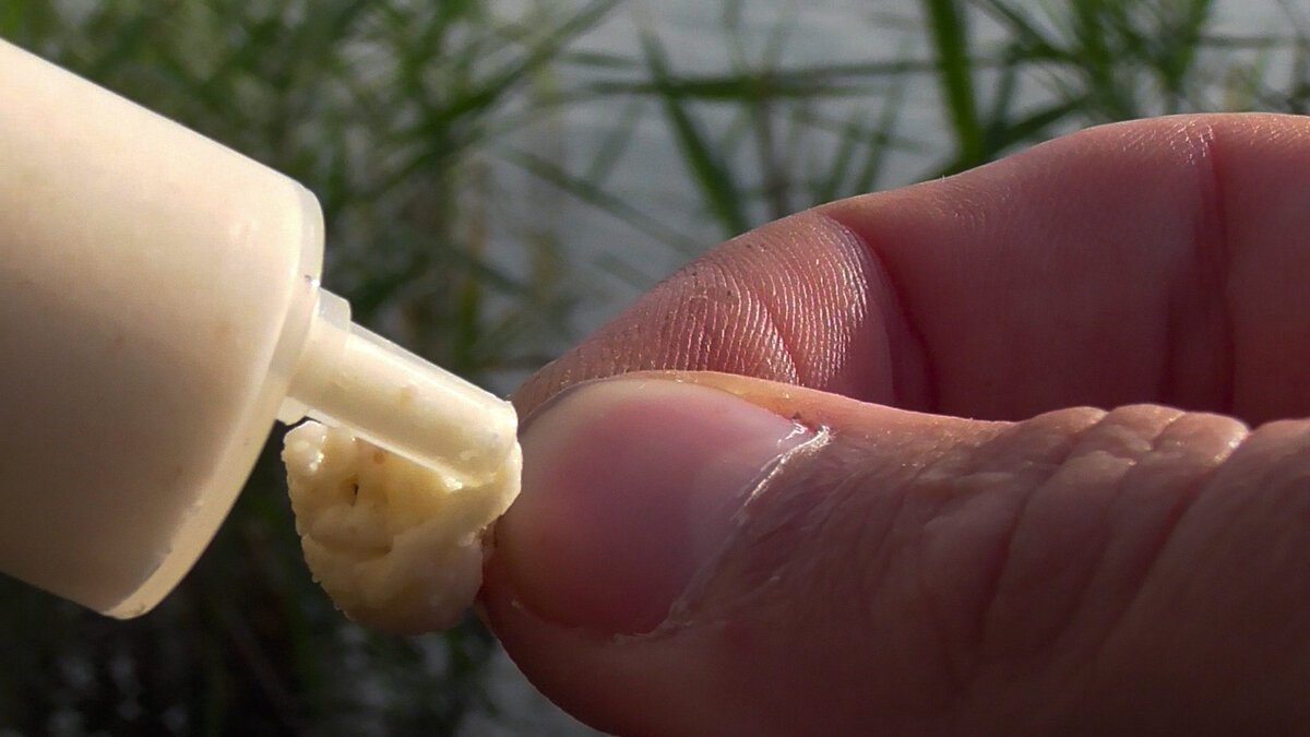Текстом сложно передать то, какой консистенцией должна правильная болтушка обладать. Она должна тянуться на пряди, если в руки её возьмёте – она будет сильно липнуть. Насаживаем на крючок её мы с помощью медицинского шприца, на 10 или 20 мл.