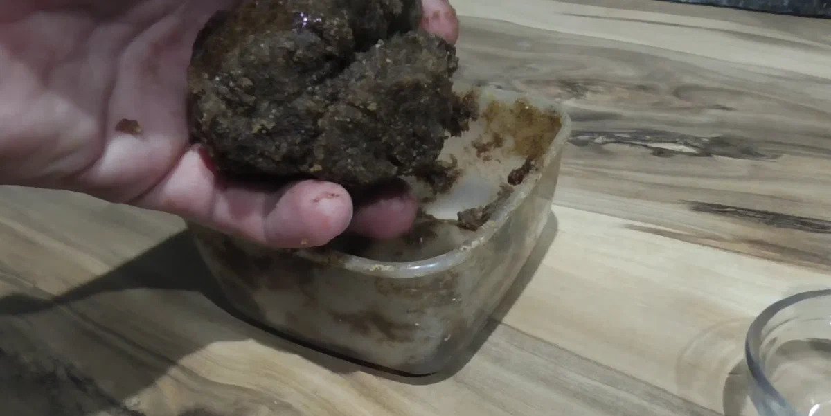 Достаю контейнер и вижу, что смесь недостаточно загустела. Я хорошенько перемешиваю ее ложкой и отправляю в микроволновку еще на минутку. Теперь мастырка получилась нужной консистенции. Чтобы она не прилипала к рукам я добавляю в нее немного рафинированного подсолнечного масла. Тщательно разминаю. Все. Насадка-бомба готова.