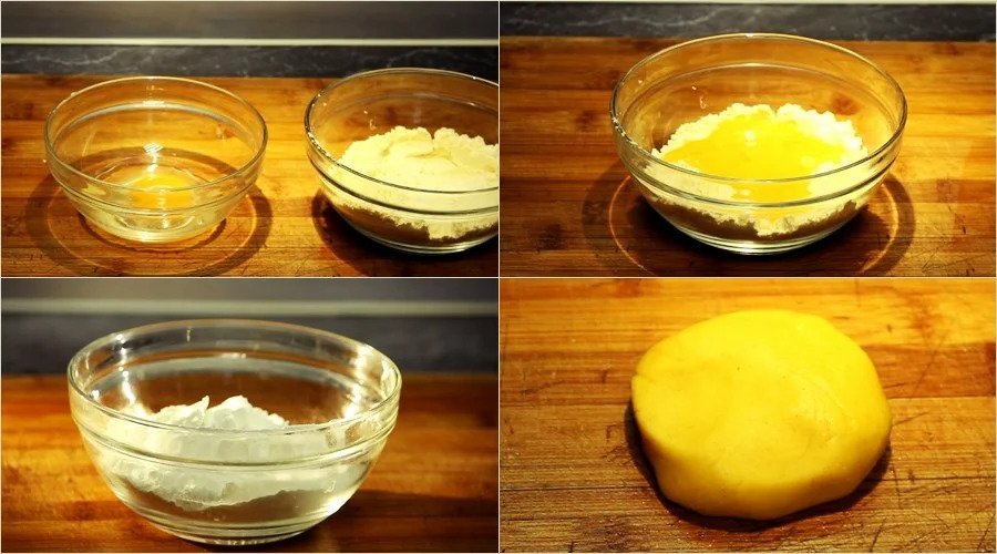 - Вливаем яйцо в смесь муки и крахмала, замешиваем тесто.