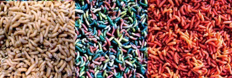 Личинок мухи можно окрасить в различные цвета, добавляя в их корм пищевые красители, имеющие жирорастворимую основу. Это основное условие, так как другие типы красителей не смогут накопиться в теле личинки.
