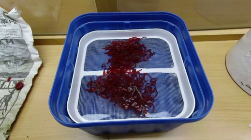 Приготовьте ёмкость с ситом. При высыпании мотыля на сито, умершие остаются на поверхности, а живые падают на дно. Воду лучше использовать холодную, отстоявшуюся. Ёмкость хранят в холодильнике. Этим способом опытные рыбаки сохраняют мотыль на долгий срок.