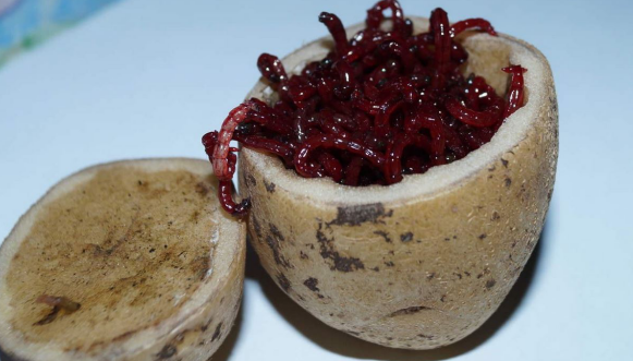 С помощью этого метода мотыль сохранится 3-4 дня. В овощах делается углубление для личинок, которое потом закрывается обрезанным куском. Мотыль обычно укладывают между капустными листьями.