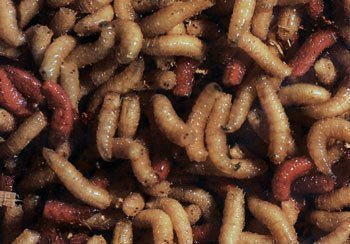 Все личинки перемещаются в следующую емкость, в которой обязательно должны быть опилки. Находясь в опилках, личинки всегда будут иметь товарный вид. Перед помещением их в емкость, желательно сделать запись с указанием даты. Опарыша следует кормить любой пищей, богатой на белки. Ею может быть куриное яйцо, легкие, печень и т.д. Откармливают его на протяжении 3-х-4-х дней, не более, потому, что в дальнейшем он от пищи откажется, достигнув своих максимальных размеров. Процедура такая: в емкость насыпаются опилки, сверху на опилки выкладывается корм, а потом высыпаются личинки.